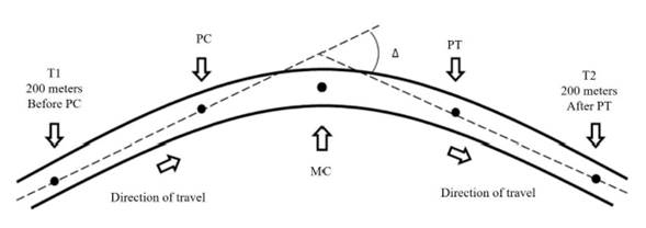 A total of 24,250 sample vehicles were observed in free-flow speed conditions in the data (count all 38 curves after data depuration). The speed pick-up sample points on the roadway and curve segments are presented in Figure 2. When the user traveled a curve, the speed was recorded at five points of interest: the tangential entry (T1, 200 m before the start of the curve), the beginning of the curve (PC), the middle of the curve (MC), the beginning of the tangential departure (PT), and the tangential departure (T2, 200 m from the start of the tangential departure). Additional data information can be found elsewhere [8].