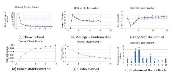 The analysis results of the optimal number of clusters are presented in Figure 3. Figure 3 (a) shows how the k-means method evaluates clustering for the various number of clusters. The change in slope or the formation of an elbow is used as a criterion to determine the correct cluster number in this case. Specifically, k values between 2 and 4 are suitable for cluster analysis engaged in the k-means method. In addition, a histogram of the optimal k value (Figure 3 (f)) summarizes the results of all the 30 approaches used in the NbClust method. It is seen that k values are found to be between 1 and 10, and the most frequent cluster numbers results are 2 and 3. Therefore, the results are a possible range of cluster numbers that can be used to choose a good one. Based on the frequency of these values, a k value of three (3) was selected for this research. This number of clusters falls within the acceptable range for applying the k-means method, which is used in the following analyses. Furthermore, three speed profiles provide a unified representation to classify the driving styles based on a membership (named cautious “c” or moderate “b” or aggressive “a” behavior [11].