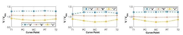 The results of the second part of the proposed scheme (i.e. clustering of vehicles speed profiles) for only speed records, only η and as+ parameters and, speed records with both additional parameters are presented in Figures 4 to 7. Figure 4 shows a clear tendency to separate the three fundamental driving styles when using any of the proposed data inputs. When speed data is used at each point in the analysis, a more significant distinction in speed behavior at points T1 and T2 is possible (see Figure 4, left and right plots)