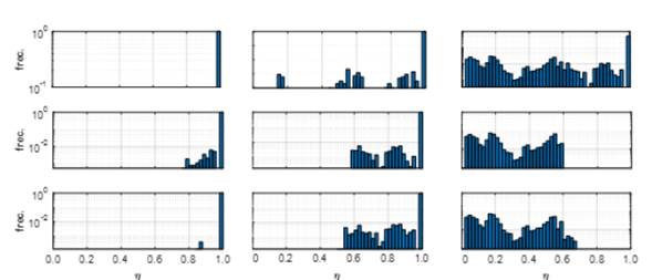 Figure 6 shows that the cluster separation classification based on the time spent travelling the curve above 80% of the limit speed (η) only matches with the aggressiveness degree when the indicators of driver behavior are used. These graphs show that by using the speed data together with the two variables inferred in the cluster analysis (lower figures), it is possible to distinguish more clearly the level of aggressiveness of the driver as seen from the time during which he/she remains close to or above the speed limit of the curve.