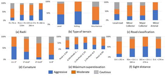 The curvature (related with the inverse of curvature radii) allows to identify aggressive driver behavior as it is less than 3° (Figure 8(d)), it may be used for quantification of road safety and defining the geometric design of the curve. When the curve superelevation is higher, the drivers exhibit a more cautious behavior (Figure 8(e)). It should be noted that during the measurement on the ground of this parameter, errors were found in the slope that the constructed curve should have since drivers tend to behave more aggressively when the slope of the curve is less than ±2%. The sight distance defines other distances such as stopping, passing sight and complex maneuver situations; these are used to design the vertical and horizontal alinement elements [10]. Figure 8 (f) shows that when this distance exceeds 92 m, the drivers’ behavior becomes more aggressive (above 40%). In general, the classification of the proposed cluster analysis approaches by three speed profiles matches the expected behavior trend governed by the geometry and operational condition of the curve.