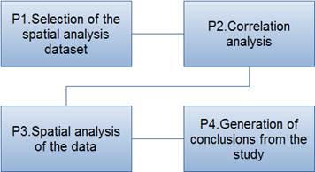For the development of this research, four methodological phases were established: selection of the spatial analysis dataset, correlation analysis, spatial analysis of the data, generation of conclusions from the study (Figure 1).