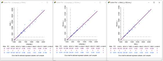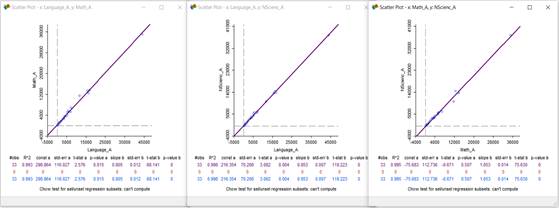 Similarly, Figure 3 shows the regression analysis of the "Advanced" level of the areas of Language, Mathematics, and Natural Sciences, which allowed to determine a high correlation between the pairs of attributes: "Language_A" and "Math_A", "Language_A" and "NScienc_A", "Math_A" and "NScienc_A". The highest correlation corresponds to the pair: "Language_A" and "NScienc_A", with a determination coefficient of 0. 998.