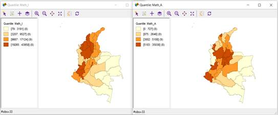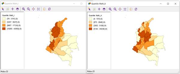 On the other hand, Figure 5 shows the 4-quantile analysis for the "Insufficient and Advanced" levels in the area of Mathematics (figures on the left and right, respectively). Addittionally, it shows that the departments with the highest number of students at the "Advanced" level of performance were: Nariño, Valle, Antioquia, Cundinamarca, Santander, Bogotá D.C., Boyacá, and Atlántico. As indicated in the analysis of the Language area, 5 of the 8 departments mentioned are in the top 5 (Bogota D.C., Valle del Cauca, Antioquia, Cundinamarca, and Santander) with the best GDPs in the country for 2020. Consistent with the above, the departments with a lower number of students at the "Advanced" level were the following: Amazonas, Guaviare, Vaupés, Guainía, Vichada, Arauca, Chocó, and San Andrés y Providencia, 6 of which had the worst GDPs for 2020 (Guaviare, Amazonas, Vichada, Guainía, Vaupés, and San Andrés y Providencia).