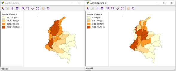 Once the regression analysis was completed, the analysis at the quantile level was implemented in the dataset's attributes. For each area (Language, Mathematics, and Natural Sciences), the geographic distribution of the Advanced and Insufficient levels was considered at 4 quantiles. Thus, Figure 4 shows the 4-quantile analysis for the "Insufficient" and "Advanced" levels in the area of Language (figures on the left and right, respectively). It also shows how the departments of Valle, Antioquia, and Atlántico were grouped for the area of Language in the quantile with the highest number of students for the "Insufficient" and "Advanced" levels (red quantile). Likewise, it is possible to observe how the departments that obtained a greater number of students at the "Advanced" level were: Bogotá D.C., Valle del Cauca, Antioquia, Santander, Cundinamarca, Nariño, Atlántico, and Boyacá. It is also important to mention that the departments of Bogotá D.C., Valle del Cauca, Antioquia, Cundinamarca, and Santander are within the top 5 departments with the best GDPs in the country for 2020 (https://www.dane.gov.co/files/investigaciones/pib/departamentales/B_2015/Bol_PIB_dptal_2020preliminar.pdf).