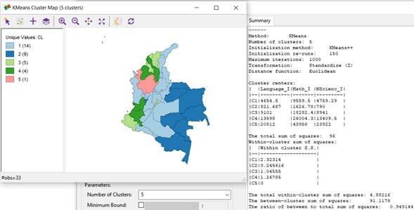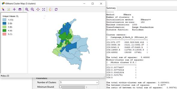 It is possible to observe from Figure 7 that the cluster including the highest number of students for the 3 considered areas of the test at the "Insufficient" level is cluster 5, whose centroid is C5={Language_I=20812, Math_I=43958, NScienc_I=23922}, which geographically corresponds to the department of Antioquia. Likewise, the cluster that groups the lowest number of students for the 3 areas of the test at the "Insufficient" level is cluster 2, whose centroid is C2={Language_I=821.667, Math_I=1626.78, NScienc_I=790}, which geographically includes the departments of Amazonas, Vaupés, Guaviare, Guanía, Vichada, Casanare, Arauca, San Andrés y Providencia, and Quindío.