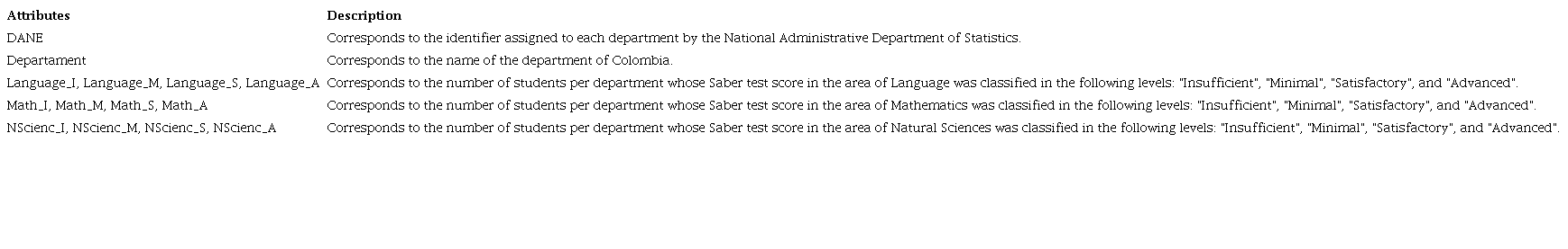 The dataset selected for this study includes geospatial data related to the performance of primary school students of the different departments of Colombia in the areas of Mathematics, Language, and Natural Sciences. This dataset has a total of 33 records or rows, which include the number of students per department that are classified in different performance levels ("Insufficient", "Minimal", "Satisfactory", and "Advanced") for the areas mentioned. Thus, Table 1 describes the main attributes associated with the 33 records of the dataset considered in this study.