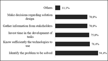 Regarding the inputs considered, it is evident that the identification of the problem to be solved (94.4%) is the most representative option by the respondents (Figure 5). In addition, software industry professionals consider that the knowledge and appropriation of technologies to be used for the development of their activities is essential when developing software (76.4%). However, although the previous option is not detailed in the literature, it does consider the transfer of knowledge as an input to start a software project and it is not necessarily associated with the use of tools. 11.1% of the respondents detailed those other inputs were the composition of the team and soft skills, which may well relate to motivation.