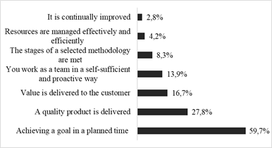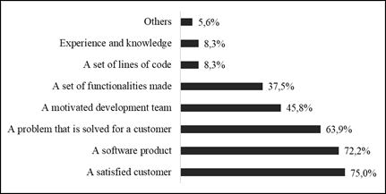 On the other hand, to refer to the outputs obtained by an ASD team, it is found that the respondents (Figure 7) include customer satisfaction (75%), the generation of a software product (72.2%), and a problem that is solved for a customer (63.9%), as the most recurrent options. In the same way, the literature corroborates these results, considering that, to satisfy a customer, it must be articulated with the principles and values of ASD, such as the frequent delivery of value that meets the expectations raised. However, professionals do not consider factors included in the literature such as: quality, efficiency, effectiveness, improvement, and team speed.