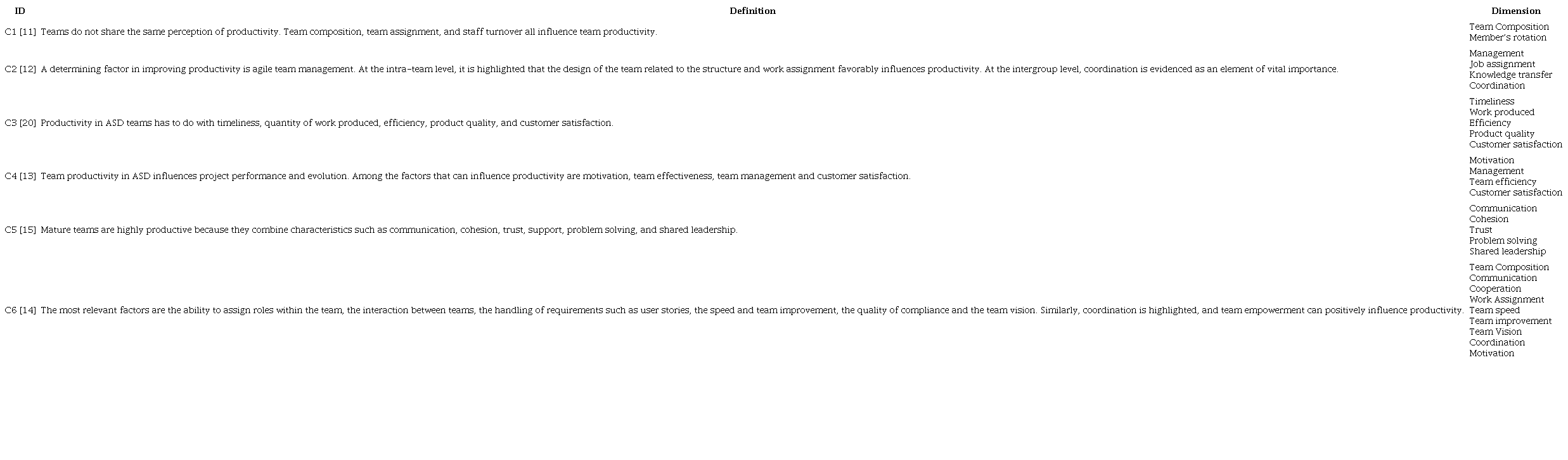 Table 4 summarizes the conceptions of team productivity in ASD presented in the literature with their dimensions.