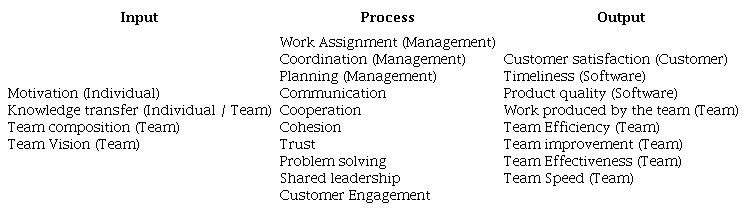 Based on the conceptions identified in the literature, dimensions that relate the inputs, outputs, or the process that a team considers becoming productive can be established. Table 5 summarizes this information.