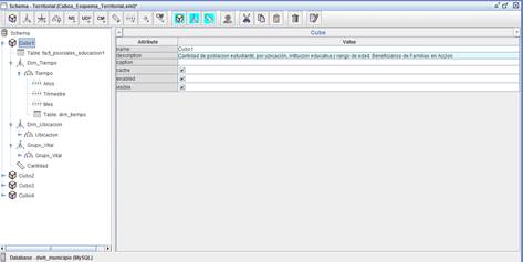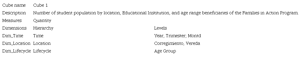 Table 2 shows the dimensions, hierarchies, and levels of Cube 1, which allows the generation and visualization of the historical information of the beneficiaries of Families in Action enrolled in the educational institutions of the municipality under analysis.