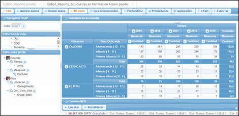Figure 4 shows the elaboration of the Cube 1 report where the PIVOT-4J Plugin for Pentaho Server was used, which allows to elaborate different types of reports and use of the levels of the hierarchies of the built cube.