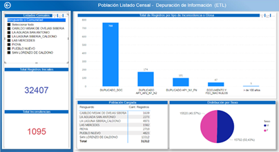 Figure 5 shows the control panel with the total population records corresponding to census lists by reservation and / or community initially uploaded and processed through the Extraction, Transformation and Loading (ETL) process , where the respective filter was applied, extracting the inconsistent records to which the respective inconsistency label was assigned through a transformation process with the Pentaho Data Integration tool. For a total of 32407 initial records, 1095 inconsistencies were obtained, out of which 768 had duplicate documents.