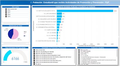 Figure 7 shows the Dashboard, which combines the information on the student population with the information from the Individual Service Provision Registry -RIPS, to know the Promotion and Prevention activities carried out on this population in a territorial entity, the user can identify the activities applied or executed by life cycle, generating expectations of fulfillment and/or increase of activities not typical of the student population between the ages of 0 to 17 years in the framework of the Mandatory Health Plan - POS.