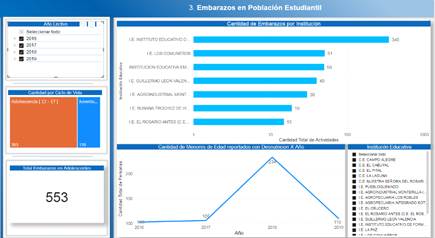 Figure 8 shows the Dashboard, which combines the information on the student population with the information from the Individual Service Provision Registry - RIPS, identifying the adolescent pregnancies presented in the student population. For this case, a total of 553 adolescent pregnancies between 2016 and 2019 can be evidenced.
