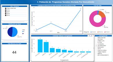Figure 9 shows the Dashboard that combines the information on the population in social programs with the information from the Individual Registry for the Provision of Services -RIPS, to know the children and adolescents who present a state of malnutrition, in this case a total of 44 minors affected by malnutrition can be seen between 2016 and 2019, and the highest percentage is determined in the early childhood stage.