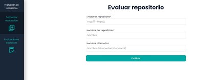 On the main page of the application (https://criteria-front.herokuapp.com/home) there are two main components: a form to start the evaluation of the repository and a menu with the options Start Evaluation and Previous Evaluations (Figure 3).
