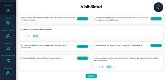 The evaluation of the fourth element involves verifying if the names found in the directories and harvesters are the same. The fifth item has two parts: verifying if the repository’s URL has https, and making sure that the URL is no longer than 40 characters and that any of them is a special character, which is defined as a friendly URL. The result of the sixth element is obtained by determining if in all the documents obtained in the directories and harvesters the phrase openAccess is present in the metadata with the tag DC.rights. The last item only involves selecting Yes or No as applicable.