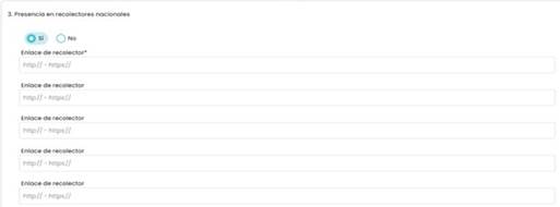 There is verification in the international harvesters and directories to make sure that one of the names found on these platforms has a similarity of at least 90% concerning those entered on the homepage, given that in some cases, they do not match entirely due to accents or connectors. In the item Presence in national harvesters, if the answer is affirmative, at least one URL of the five possible entries must be entered, as shown in Figure 5.