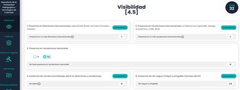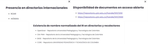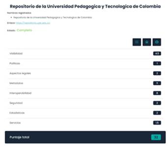 Moreover, Figure 8 presents the result of the evaluation process of the repository of Universidad Pedagódica y Tecnológica de Colombia.