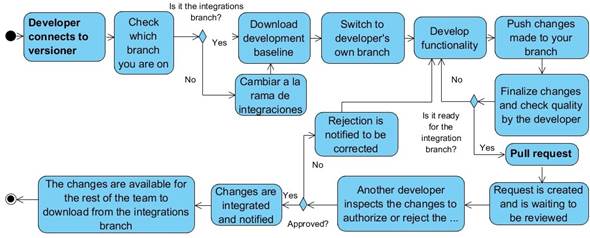 It is recommended to integrate changes from the developer branch into the integrations branch through a pull request and not directly. This generates a request submitted for review (manual code inspection) so that a team member determines if the changes do not negatively affect the project and comply with the development policies implemented in the team (code standard). If the changes are authorized, the new is included (merged) in the desired branch through the versioner, and the tool automatically notifies members of its success through email. Otherwise, it indicates that it has been rejected, and the reason is supplied with the aim that the developer who requested to upload the change can take the necessary corrective actions and try again. Fig. 1 summarizes the step-by-step of what has been mentioned. Additionally, it is recommended that all members always download the changes from the integrations branch at the start of the working day to work on the latest development version, and at the end of the day, they should always upload the changes they have made to their branch.