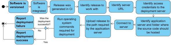 When the source code is versioned, and the CI generates the deployable unit file, which must be put on an application server for the software to be operational, the CD is possible, according to [14]. The CD practice takes advantage of the fact that the CI has generated the deployable unit, so as not to repeat this process, and transfers that file to the server (physical or in the cloud) where the application server that will deploy it is hosted. Once the file has been taken to the server, it is placed in the required location, depending on the application server. The operating system-specific commands required to perform the deployment are then executed, which in most cases cause the applications server, but not the physical server, to require to restart its service. The above is summarized in Fig. 3.