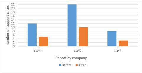 COY1 reported 9 to 12 weekly requests before practices, COY2 had an average of 16 to 22, and COY3 had 5 to 8 weekly reports. Following the implementation of best practices, COY1 reported a decrease of 41.7% of cases, reaching a report of 3 to 5 weekly requests, while COY2 indicated a decrease of 45.5%, achieving a range of 8 to 10 reports per week. COY3 showed a decrease of 37.5% of the reports reflected in only 2 to 3 weekly requests. The above results are summarized in Fig. 4.