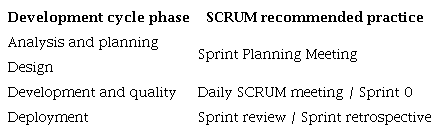 According to [9], the software development cycle comprises analysis and planning, design, development and quality, and deployment. These phases overlap with the agile SCRUM framework and its recommended practices described in [10]. Table 1 below lists the SCRUM practices for each phase of the development cycle.
