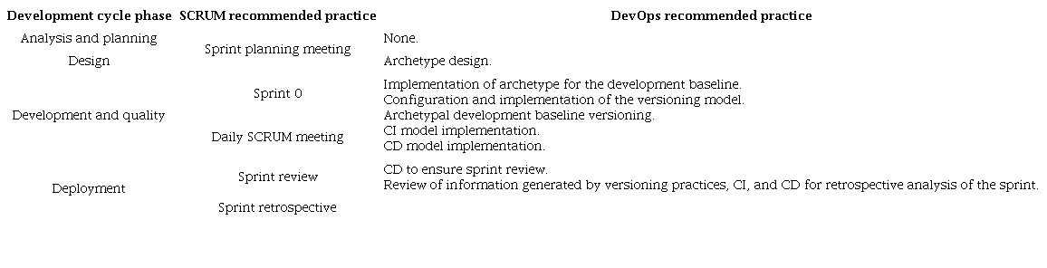 During the development and quality phase, it is required that at the beginning of each project, according to [10], a sprint 0 or preparation for development is carried out. This allows verifying that the entire team knows what will be done and how it will be done, carrying out concept tests, building the archetype, creating the repository for versioning and implementing the model to be used in it, configuring the tools that support CI and CD practices, versioning the development baseline and verifying that all team members have access to the tools and configurations required for the formal start of the project. Once sprint 0 has been completed, development begins.