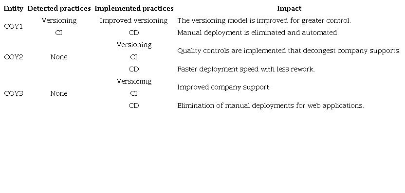 The practices of versioning, CI and CD were significant for each company, integrating the different changes in a controlled way and always being prepared to face a production release. COY2 and COY3 suffered most from manual deployments because, in some situations and due to response time pressure on support, they directly handled the code deployed on the server to solve a problem, not only losing control of the change but also occasionally generating inoperability at times due to poor handling. Measurement of effective deployments before implementing the practices shows that COY1 had a 90% success rate due to a deployment checklist that is executed manually. After implementation, they obtained 100%, and the manual review of the checklist disappeared, leaving the developer in charge free to fulfill other functions. COY2 had a 50% rate of correct deployment before the practices because its process is empirical and without any control. After implementation, 100% correct deployments were obtained. COY3 had 80% correct deployments before the practices because it also had a checklist. After implementation, they reached 100%. Fig. 5 summarizes the results presented above.