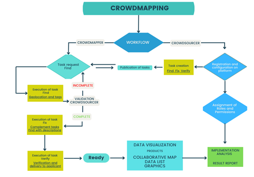 The tasks proposed in the workflow are based on the Find, Fix, Verify pattern implemented in the urban object mapping and proposed by Van Alphen [12], which divide tasks into a series of generation and revision stages to guarantee a high quality in the results obtained by the crowdmappers.