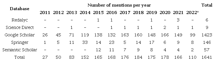 In order to have an overview of the adoption of Crowdmapping in the scientific community, a documentary search was conducted to establish the frequency with which the term "Crowdmapping" appears, including filters by year to visualize the growth of the information, setting as a base the year 2008, in which it was registered the first crowdmapping case, and filtering by increasing period. The results are displayed in Table 1. The information presented in the tables indicates an incremental pattern representing an interest of the scientific community in this novel practice.
