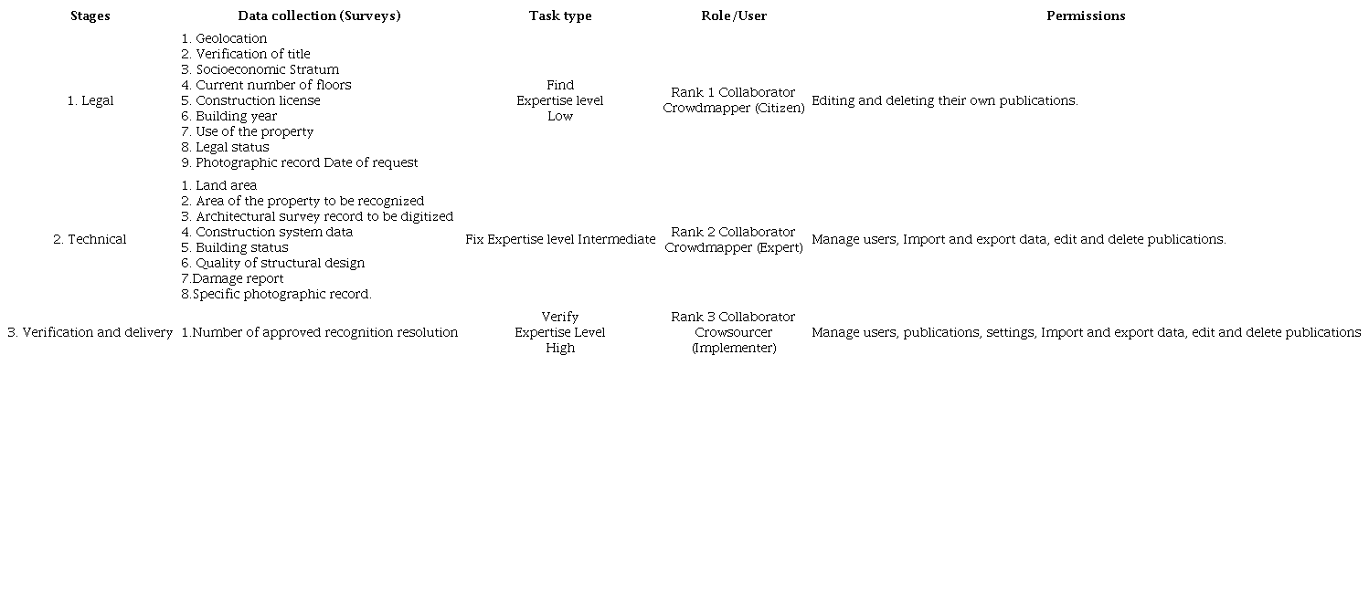 Considering that the objective of using crwodmapping in the process of recognition will be to collect information and geolocate it in a base map and not to create the map as such, the Ushahidi platform is selected for its implementation. The data collection and information management process of Ushahidi, in Table 3 defines tasks, surveys, roles/users and permissions required for the implementation of each stage of the VIS recognition process.