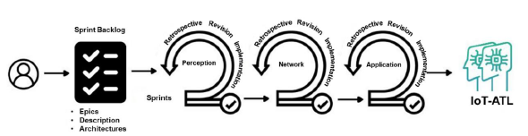 We use the Scrum development methodology [15], ideal for a small development team, to obtain the prototype quickly. The Scrum framework aims to deliver value in short periods, and it has three pillars: transparency, inspection, and adaptation. Its central component is the Sprint, which allows the project team to self-organize, focus on providing value in each delivery, improve forecasting, monitor progress, and project results [15]. Figure 1 shows the detail of the methodology used to build the components of the three layers of the architecture that support the IoT-ATL prototype.