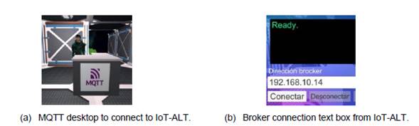 US-4 Test. Interact in real-time with physical components of the laboratories from a digital environment. Assessed variable: connectivity and access to the IoT-ALT. 1) The user can connect to the IoT-ALT. Figure 3 shows how users connect to the IoT-ALT. 2) The user could interact with the IoT-ALT's different spaces, elements, lighting, and information. Figure 4 and Figure 5 present the digital spaces replicated in the IoT-ALT. Figure 7 shows the interactions with the lighting in the management office and the prototyping laboratory. Finally, Figure 8 shows how users can see and interact with the technological elements of the laboratory in real-time.