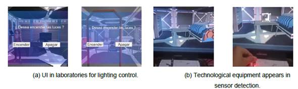Figure 5 shows the virtual room and the prototyping laboratory, where the user verifies the lighting, the existence of the technological elements, and digital information on the use of each element.