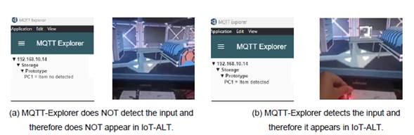 US-1 Test. Real-time verification of existing and available elements in the laboratory according to US-1. Assessed variable: Existence and detection of the element in IoT-ALT. 1) The lab element can be seen in IoT-ALT if it is available. Figure 8(a) shows from the MQTT-Explorer desktop application that the prototyping lab computer was not detected and thus does not appear in IoT-ALT. In Figure 9(b), the input appears. 2) The lab item is NOT visible in IoT-ALT if it is not available.