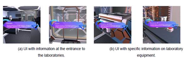 US-2 Test. Verification of the obtention of usage information when the element is present. Assessed variable: UI messages about the usage information of the elements present in the laboratory. 1) When entering one of the laboratories, the user can see messages that present specific details of the space, as shown in Figure 9(a). 2) When the user approaches the laser cutter and engraver, cutting plotter, 3D printers, and MAC computers, messages with relevant information about the input appear, as shown in Figure 9(b).