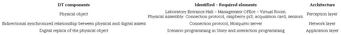 Table 1 shows the mapping of the DT components with the identified and required elements and their location in the architecture defined for the IoT-ATL prototype.
