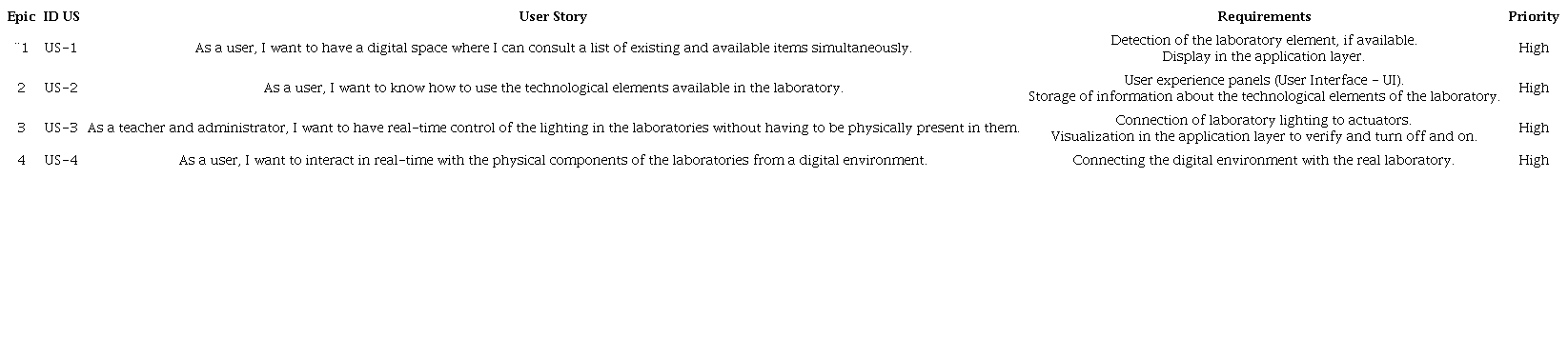 Epics. Users interested in the laboratory can interact and be informed of its availability status through real-time interaction with the prototype supported by DT. We defined the following epics to address these interactions: Epic 1: Interested users can know which technological elements are in the laboratory and which are available for loan. Epic 2: Users can know how the technological elements of the laboratory are used. Epic 3: Users can interact in real-time with the lighting in the laboratory spaces. Epic 4: Can users obtain updated information about the laboratory through the IoT-ATL prototype?