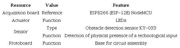 Perception Layer. The components that make up this layer and interact with the other layers are defined considering their functionality and the elements available in the Laboratory [14]. IoT resources are used for the physical assembly of the prototype, as seen in Table 3.