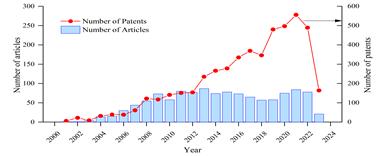 The number of patents generated during this period was 4914, with over 2186 patents generated in the last 5 years (2019-2023), i.e., nearly 45% of the total production. The strong growth in patent generation started in 2008, with over 100 per year. The country with the highest patent production is United States, followed by China. Their generation is closely linked to significant investment in R&D from both the public and private sectors in the United States, as well as the national innovation strategies and incentive policies developed by China [35]. The United States Patent and Trademark Office (USPTO) has filed the highest number (3939).