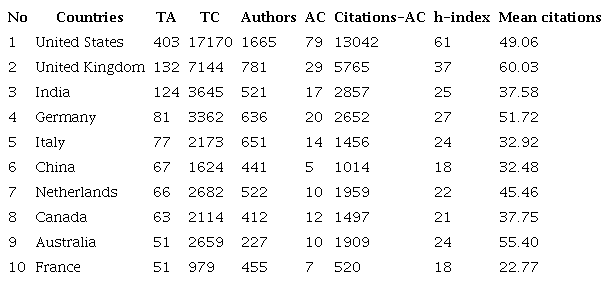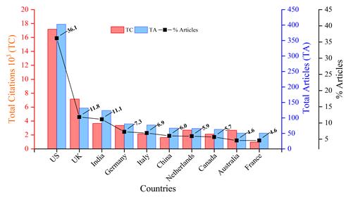 Table 1 presents the analysis of the top ten countries with the highest scientific production. It is worth noting that the United States contributed 403 documents, accounting for 33.5% of the total. The average number of citations in the United Kingdom was 60.03, while Australia had an average of 55.4 citations. The top ten countries accounted for 92.7% of the total number of documents