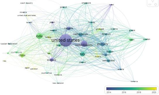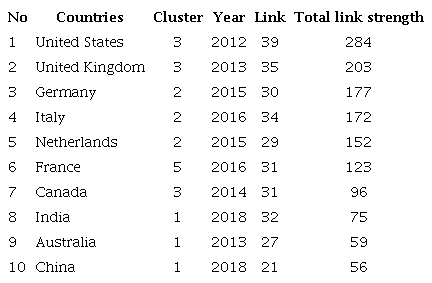 Table 2 presents the number of collaboration networks and the total link strength between countries, from strongest to less strong. The information about the countries is distributed into 5 clusters that group their characteristics, the year represents the most active period. It is worth noting again that, in terms of link strength, China has the lowest value, while the United States and the United Kingdom are the countries with the strongest collaboration.