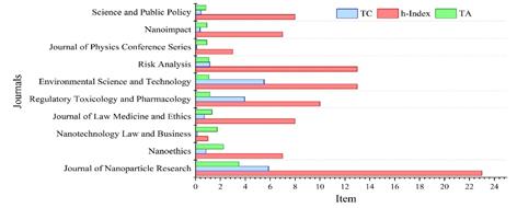 Figure 4 displays a relationship between journals, h-index, and citations of the top 10 most influential journals. It is worth noting that the journals with the highest h-index in the research field are the Journal of Nanoparticle Research, followed by Environmental Science and Technology and Risk Analysis, with h-index values of 23, 13, and 13, respectively. These journals also have citation percentages of 5.55%, 5.51%, and 1.15%, respectively. This indicates a high level of productivity and citation impact for these journals.