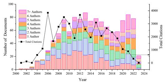 Figure 5 illustrates the relationship between the number of authors per publication and the number of citations per year. There are 305 articles with a single author, accounting for 25.33% of the total articles, followed by 250 articles with 2 authors (20.76%), and 187 articles with 3 authors (15.53%). For the cases of 4, 5, and 6 authors, percentages of 11.7%, 8.64%, and 4.98% were found, respectively. Finally, there are 157 articles with 7 or more authors, corresponding to 13.04%. The years 2006, 2009, and 2012 had the highest degree of citation, with 9.34%, 8.54%, and 9.0%, respectively. A positive citation trend was observed starting from 2004, reaching its peak in 2009. However, from 2017 onwards, there has been a declining trend in citations.