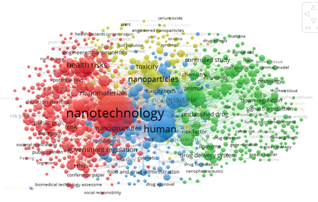 A total of 9952 keywords were identified in the analysis. However, only 898 showed some form of connection and occurred at least 5 times. These keywords were grouped into four clusters. The first one, in red, includes 331 words related to policies, nanotechnology, governance, regulation, and health risks, among others. The second cluster, in green, consists of 275 words referring to human risk factors, drug classification and efficacy, medical nanotechnology, and regulation. The third cluster, in blue, comprises 158 words associated with exposure, ecotoxicity and nanotoxicity, chemical composition, and nanomaterial safety. Finally, the fourth cluster, in yellow, gathers 134 words related to agriculture, packaging, food, cosmetics, quality control, and hazards, among other topics. Among the top 15 words with the highest occurrences are terms such as risk assessment, human, health risks, and regulation.