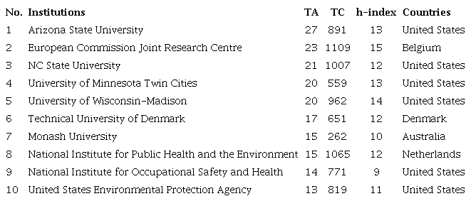 The top ten institutions with the highest number of documents represent 18.37% of the total documents and 19.7% of the total citations. Additionally, there is a significant dispersion of documents, with 58% of institutions having between 3 and 5 documents each. The maximum number of documents per institution was 27, resulting in a coefficient of variation of 63.1%. Among the ten institutions listed in Table 3, the ones with the highest number of citations are the European Commission Joint Research Centre, NC State University, and the National Institute for Public Health and the Environment. They work in specific areas such as pharmacology and environmental sciences, engineering, and medicine, respectively. Regarding the geographical distribution of the documents, 60% of them come from the United States, followed by Belgium, Denmark, Australia, and the Netherlands.