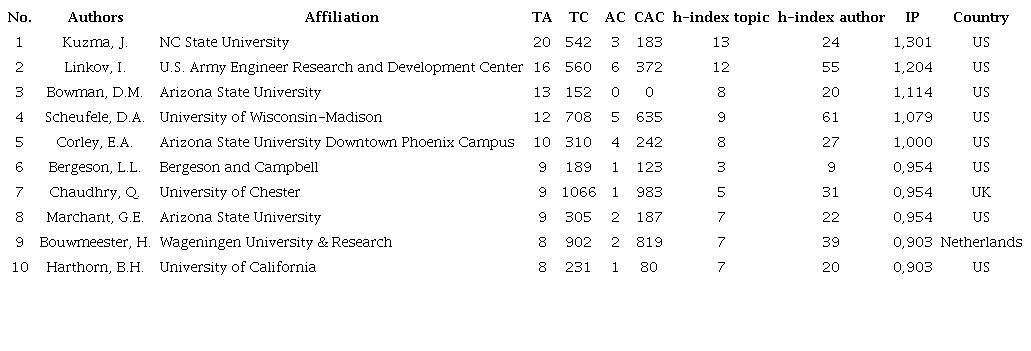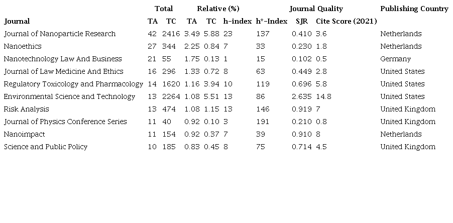 Table 4 presents the top ten most productive journals in Nanotechnology Regulation and Regulatory Topics, based on the number of documents. It includes the total number of articles (TA), total citations (TC), and their relative percentages. In terms of journal quality, it provides the h-index, the topic-based h-index, the Scimago-Journal Rank (SJR) indicator, and the CiteScore (2021). The number of documents published in these journals accounts for 14.8% of the total documents and 19.1% of the citations. The publishing countries of these journals are the United States, the Netherlands, and the United Kingdom, in equal proportions.